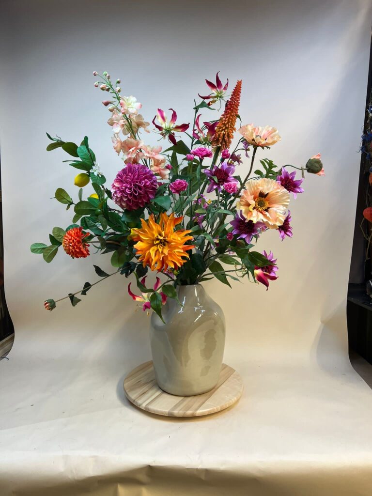 In de winkel kun je terecht voor losse bloemen en planten of we maken samen een prachtig passend boeket voor jouw eigen vaas (love it, lekker meenemen!) of voor een vaas die je in de winkel uitgekozen hebt. Grote boeketten maak ik meteen mooi voor je op door het gebruik van steekschuim (Oasis speciaal voor zijden bloemen) of zand. Ook bloemstukjes, plantenschalen en living walls kunnen we maken en dit doen we ook met veel plezier!