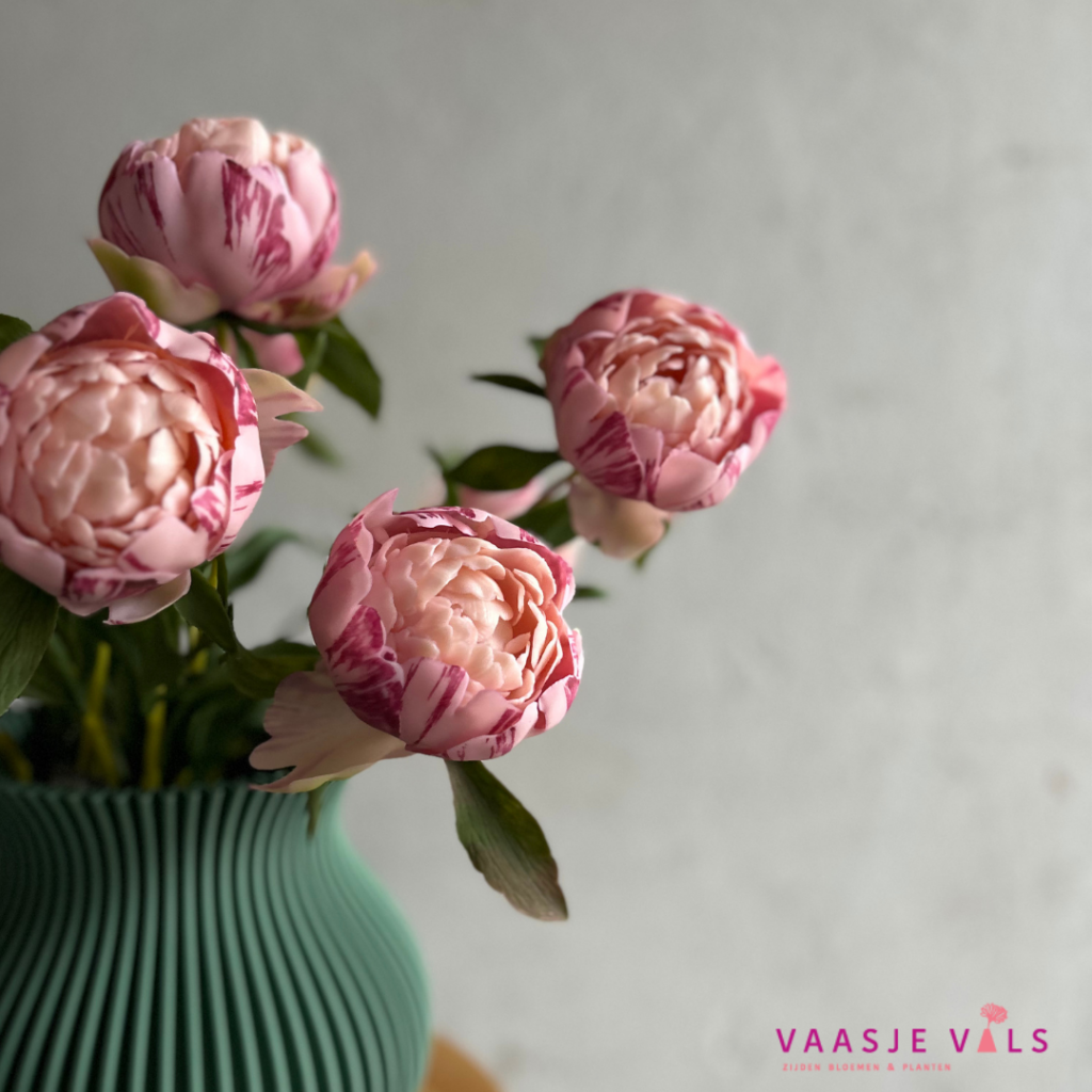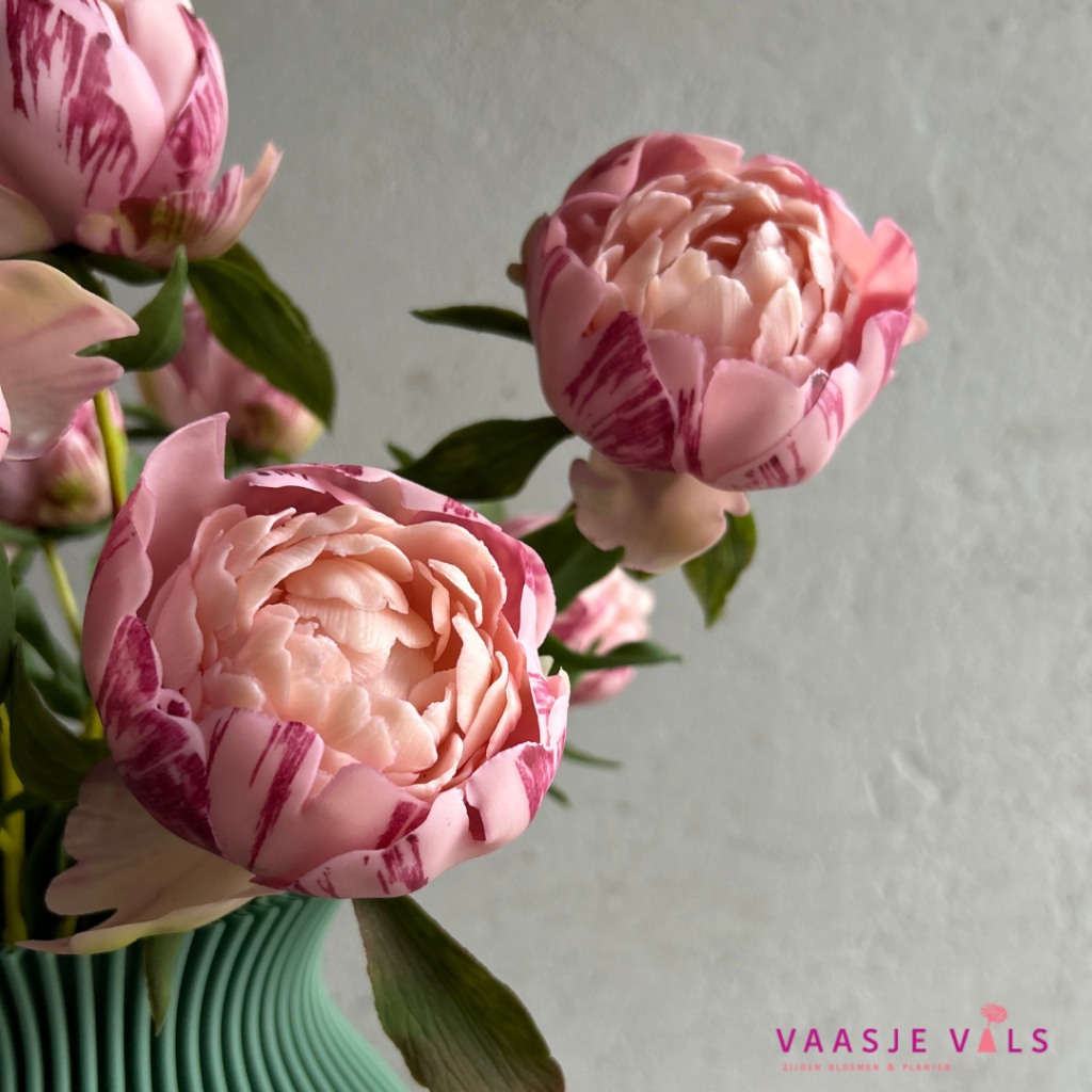 Deze pioenen (om te zoenen!) zijn niet van echt te onderscheiden. Ze zijn gemaakt van hetzelfde materiaal als onze bestselling tulpen maar dan iets dunner. In 1 bosje zitten 3 pioenen van dezelfde grootte en ze zijn 63cm lang. Ze hebben een mooie zachtroze kleur met wat donkerroze strepen.