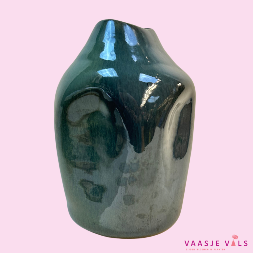 Deze prachtige veelzijdige vaas in de kleur Dark Green is een mooi rustpunt in je interieur. Door de glanzende afwerkingen en de handgevormde deuken in de vaas pakt hij op veel verschillende manieren het licht in je woonkamer. Zijn vorm maakt het een het geschikte vaas voor op tafel, zowel rond als rechthoekig, en voor een wat lager en een hoog boeket.